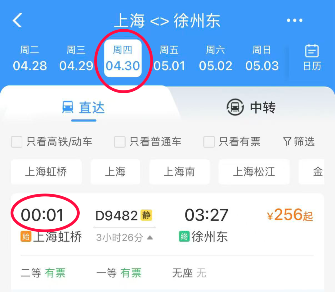 舉個例子,從上海開往徐州的D9482次列車,發車時間為4月30日0時01分,旅客則需要在4月29日晚前往上海虹橋站候車。