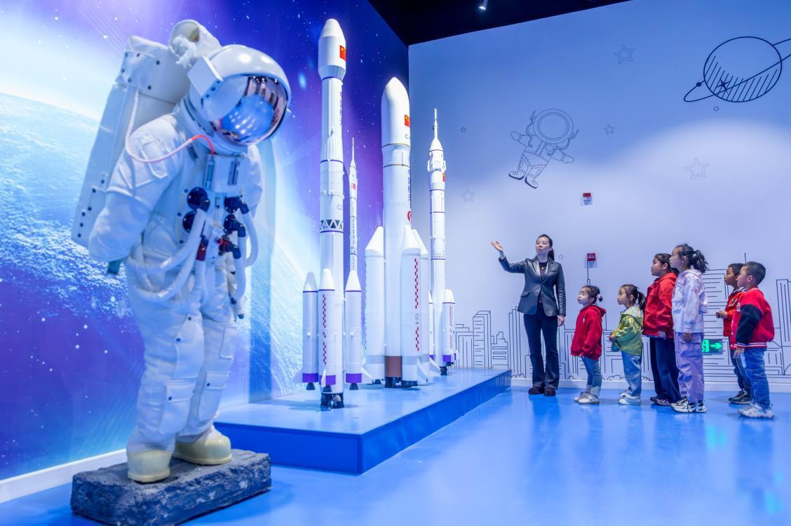 2026年4月23日,甘肅張掖,孩子們在科技館航天科普展廳近距離參觀長征系列火箭模型。