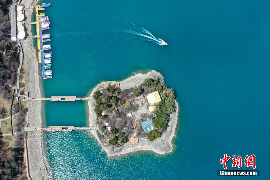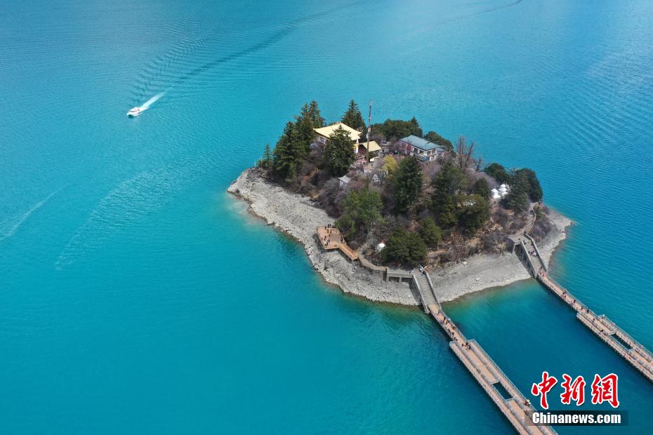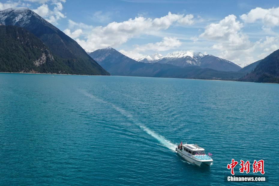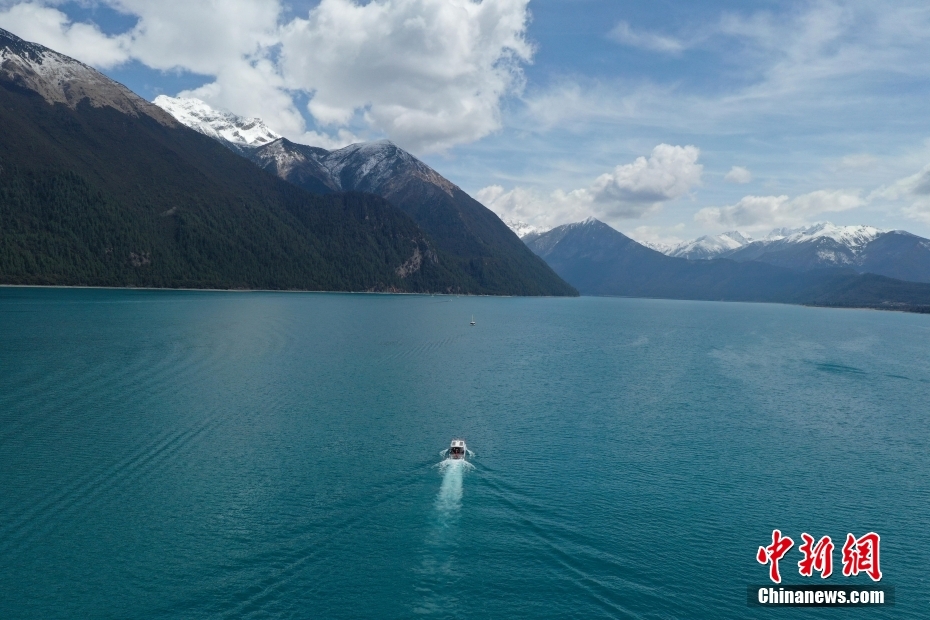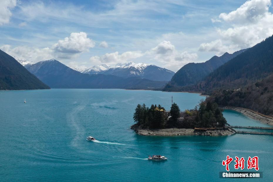 4月6日,西藏林芝工布江達縣巴松措景區游人如織。春日里,湛藍湖水與巍峨雪山相映成趣,游客游玩湖心島或乘船游覽,沉醉在這湖光山色中。圖為巴松措里的游船。(無人機照片)中新社記者 貢嘎來松 攝