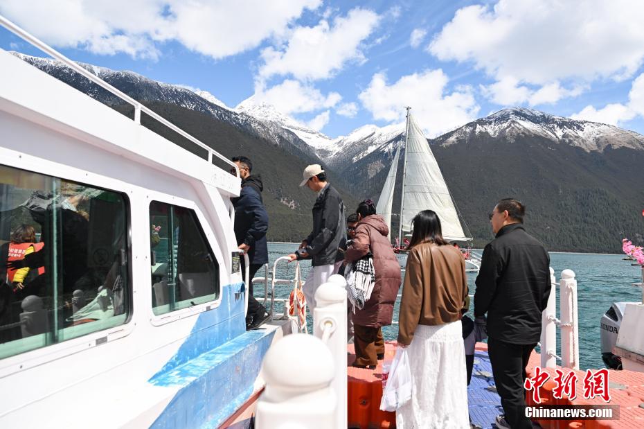 4月6日,西藏林芝工布江達縣巴松措景區游人如織。春日里,湛藍湖水與巍峨雪山相映成趣,游客游玩湖心島或乘船游覽,沉醉在這湖光山色中。圖為游客準備乘船游覽巴松措。中新社記者 貢嘎來松 攝