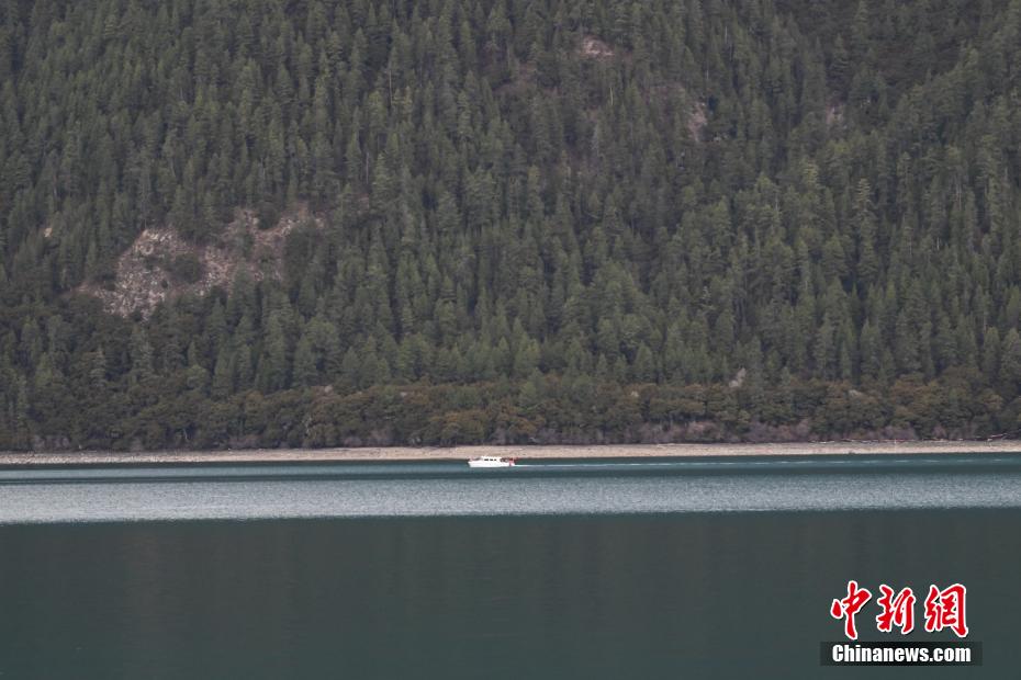 4月6日,西藏林芝工布江達縣巴松措景區游人如織。春日里,湛藍湖水與巍峨雪山相映成趣,游客游玩湖心島或乘船游覽,沉醉在這湖光山色中。圖為巴松措里的游船。中新社記者 貢嘎來松 攝