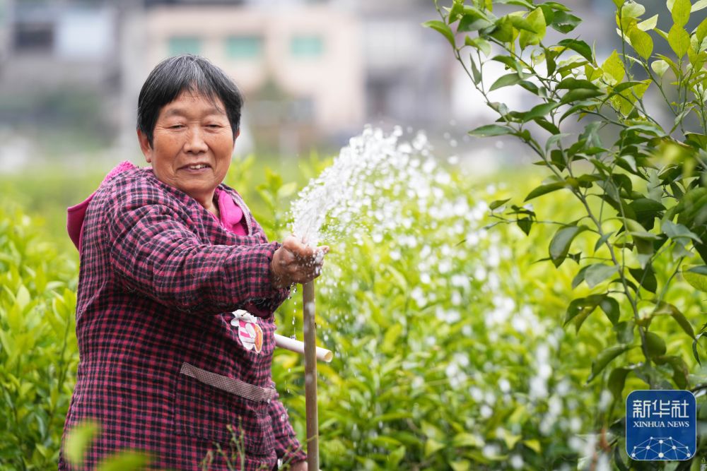 3月17日,在重慶市北碚區(qū)澄江鎮(zhèn)一柑橘種苗基地,工人在給柑橘種苗澆水。新華社發(fā)(秦廷富攝)