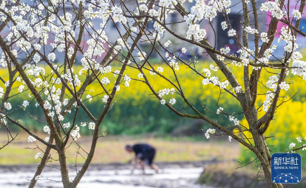 3月17日,在貴州省銅仁市玉屏侗族自治縣朱家場(chǎng)鎮(zhèn)混寨村,村民在李花間整地。新華社發(fā)(劉德軍攝)