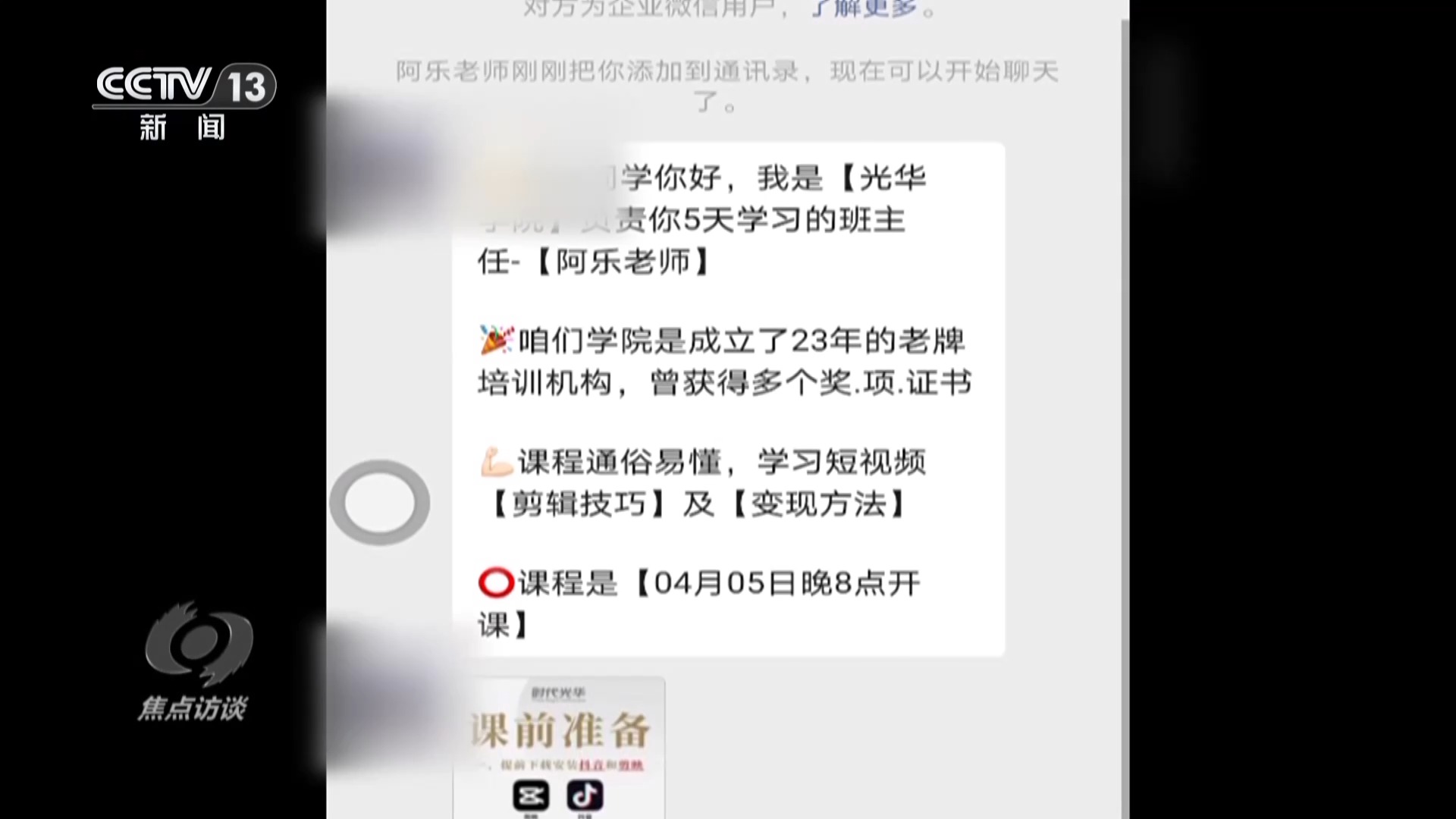 黃先生的遭遇并不是個案。記者瀏覽多個網絡平臺,發現類似的廣告比比皆是,五花八門,0元學配音、0元學書法、0元學易經……記者隨機點開了一家賬號主體為北京時代光華科技有限公司的0元5天剪輯直播課,添加所謂的老師微信之后就被拉進了一個微信群,4月5日晚上8點,課程開始了。