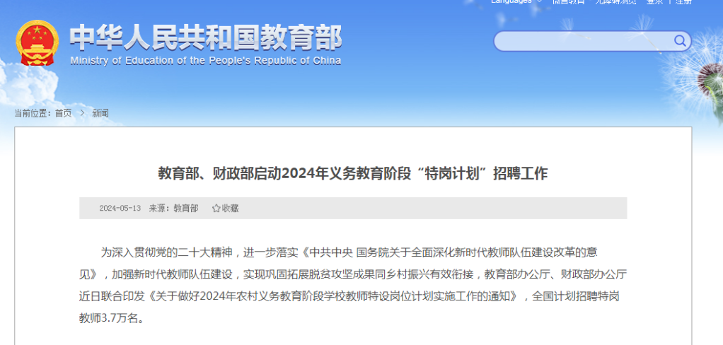 記者5月13日從教育部獲悉,教育部辦公廳、財政部辦公廳近日聯(lián)合印發(fā)通知,就做好2024年農(nóng)村義務教育階段學校教師特設崗位計劃實施工作進行部署。根據(jù)通知,2024年全國計劃招聘“特崗計劃”教師37000名。
