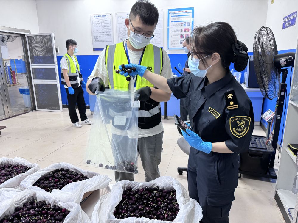 廣州白云機場海關關員對新產季進口車厘子進行監管。(受訪者供圖)