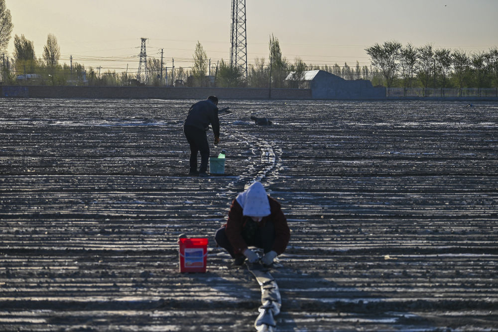 2024年4月19日,在新疆沙灣市,農民在棉田里安裝連接泵房和滴灌帶的供水系統。