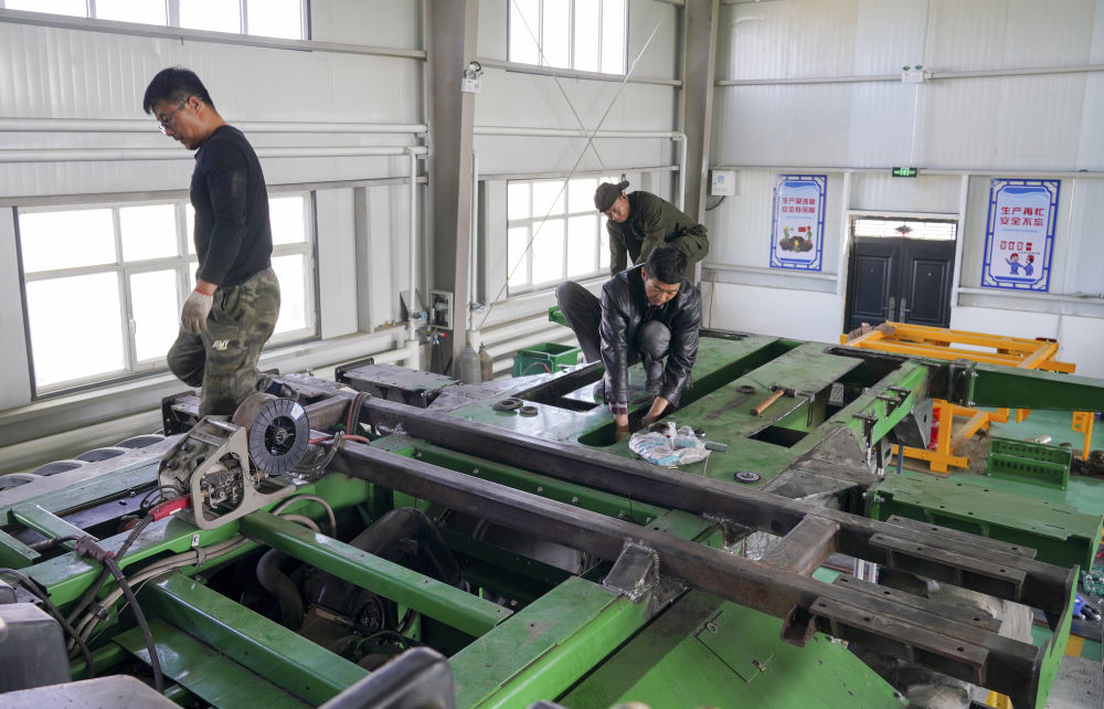 2024年4月18日,在新疆沙灣市,工作人員在韓波的農機專業合作社改裝農機。