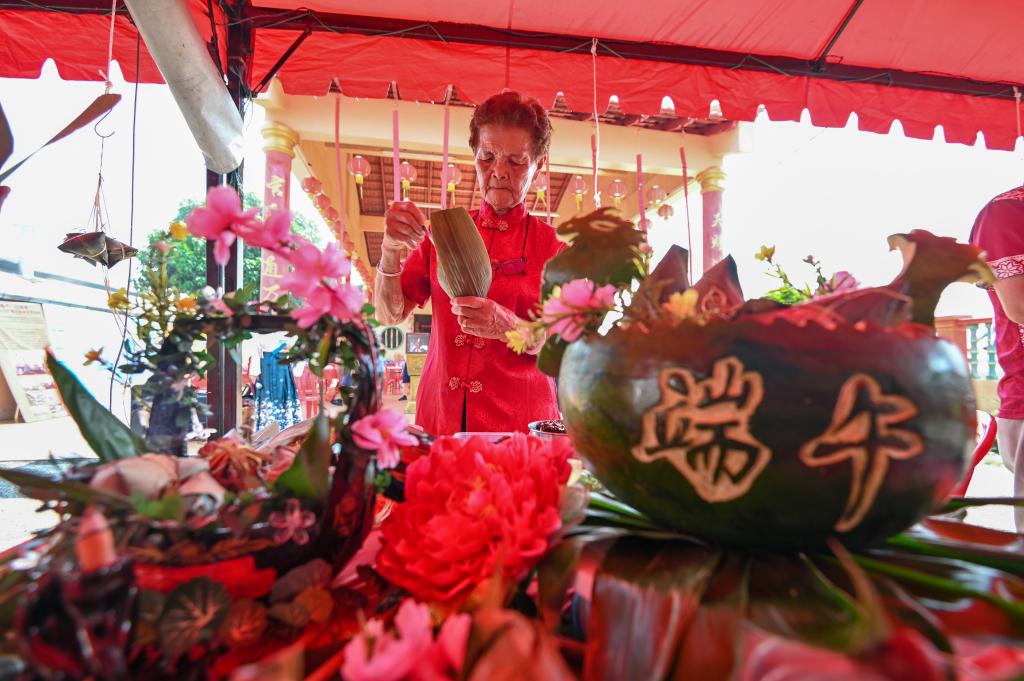 6月8日,一名女子在馬來西亞馬六甲市參加裹粽子比賽。當日,馬來西亞馬六甲市舉辦“2024年慶端午”系列活動,人們以裹粽子、游龍舟等方式迎接端午節。新華社 張紋綜 攝