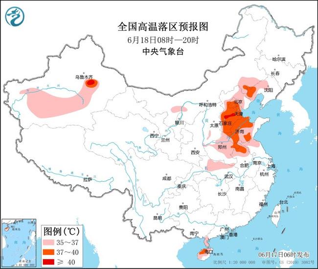 中央氣象臺6月17日06時繼續發布高溫黃色預警:預計17日白天,內蒙古西北部、新疆南疆盆地和東部、河北中南部和東北部、北京、天津、遼寧西部、山東中西部、河南東部和南部、安徽北部、湖北東北部、海南島大部等地有35~36℃高溫天氣,其中,新疆南疆盆地、河北中南部、北京南部、遼寧西南部、山東北部等地部分地區最高氣溫37~39℃,新疆吐魯番盆地等地局地可達40℃以上。