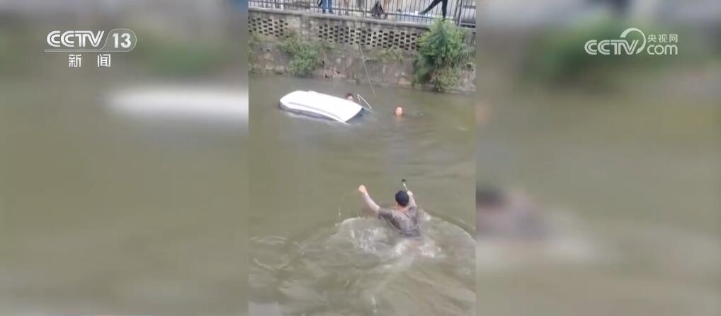 畫面中可以看到,這輛白色小車即將被河水沒過車頂。緊急關頭,三名熱心群眾先后跳下河涌,聯手營救被困司機。同時岸邊群眾也立即報警,請求救助。