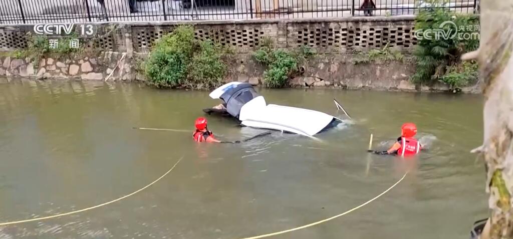 三人齊心協力幫司機脫困,并將他送往醫院治療。隨后,接到報警的消防救援人員也趕到現場,下水查看確定車上無人員被困。