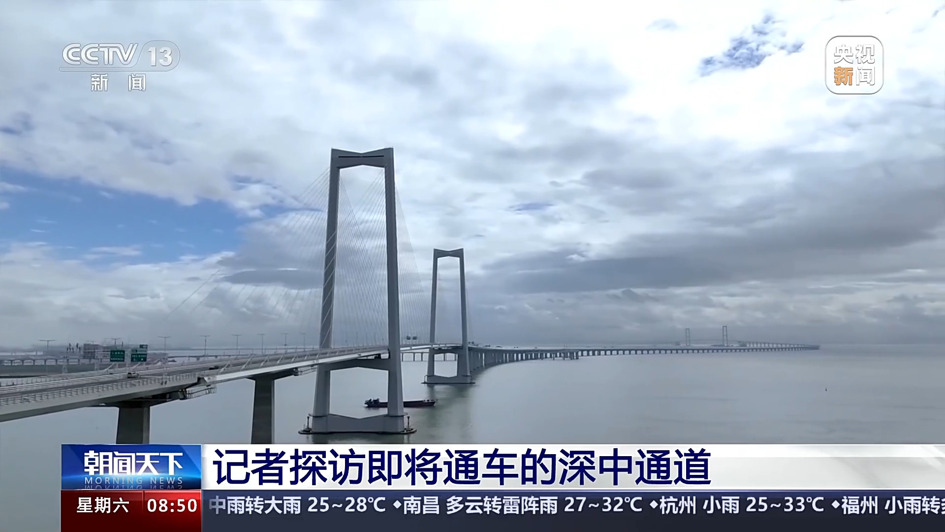 總臺記者 王思元:現在我們就已經行駛到了深中通道的一個制高點的位置,這個位置離伶仃洋的海面有91米高。也就是相當于30層樓的這個高度,大家可以看一下海面。