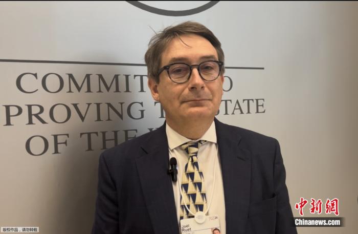 2024年6月27日,法國橋智庫主席、G20工商峰會能源工作組成員周瑞(Joel Ruet)在2024年夏季達沃斯論壇期間接受中新網專訪。中新網陳彩霞攝