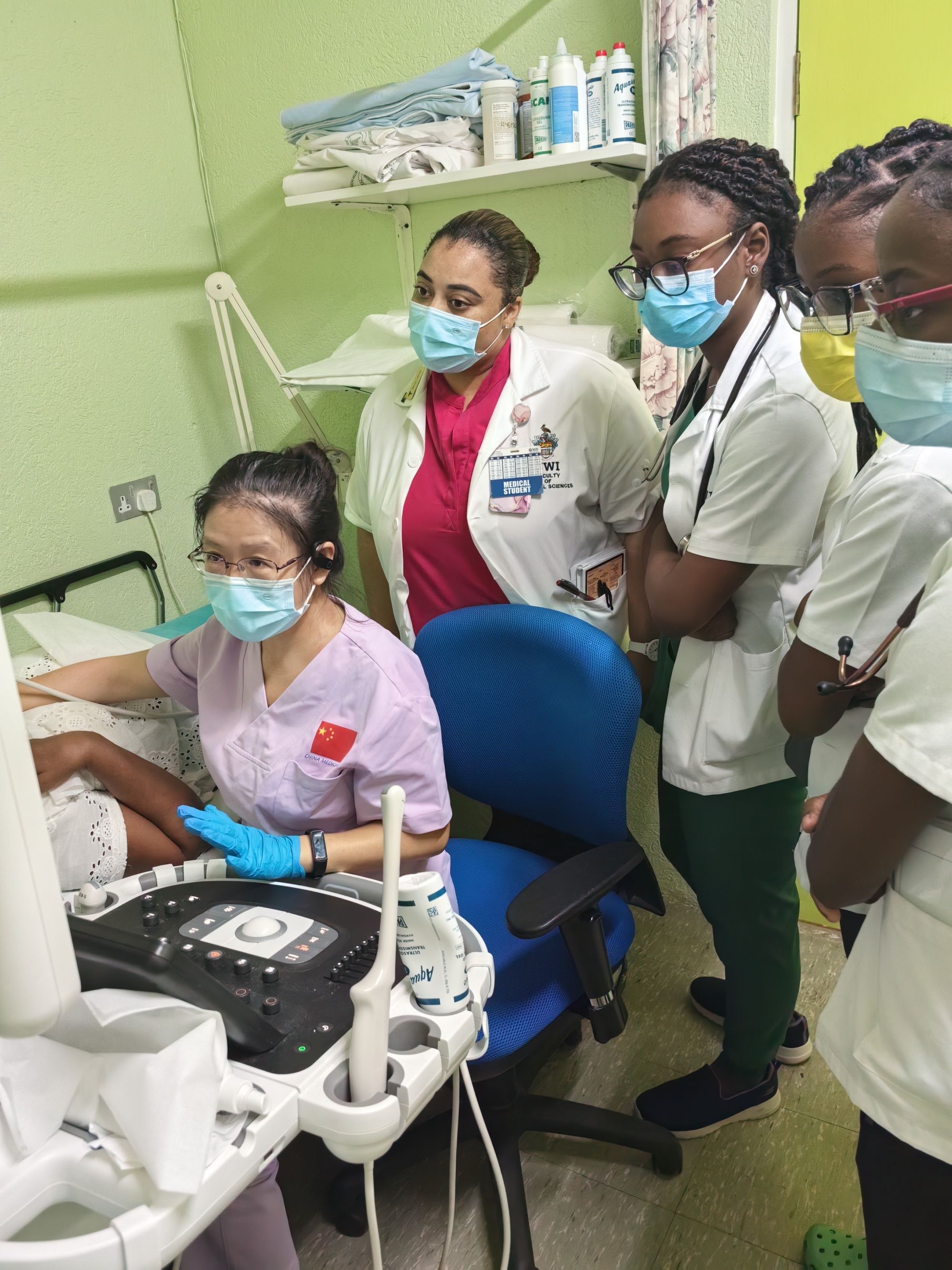 劉麗萍(左一)開展巴巴多斯第一例超聲造影技術
