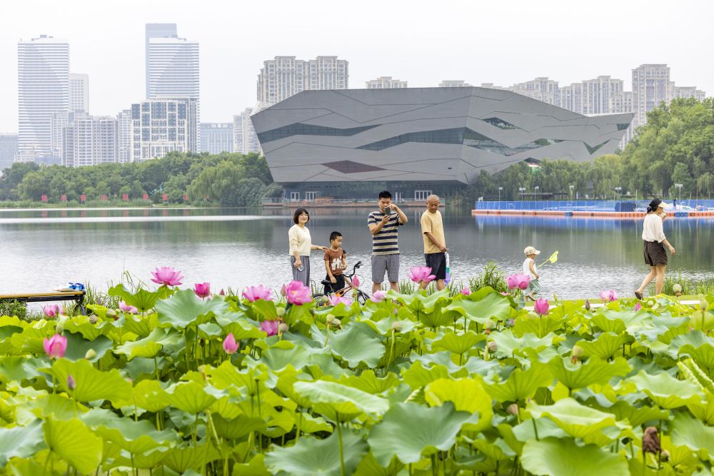 7月14日,人們在江蘇省泰州市天德湖公園荷花池賞荷游玩。新華社發(fā)(湯德宏攝)