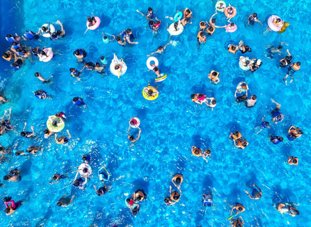 7月14日,人們在重慶市酉陽土家族苗族自治縣一水上樂園游玩戲水(無人機(jī)照片)。新華社發(fā)(邱洪斌攝)