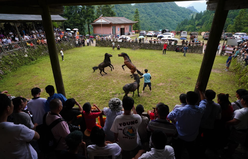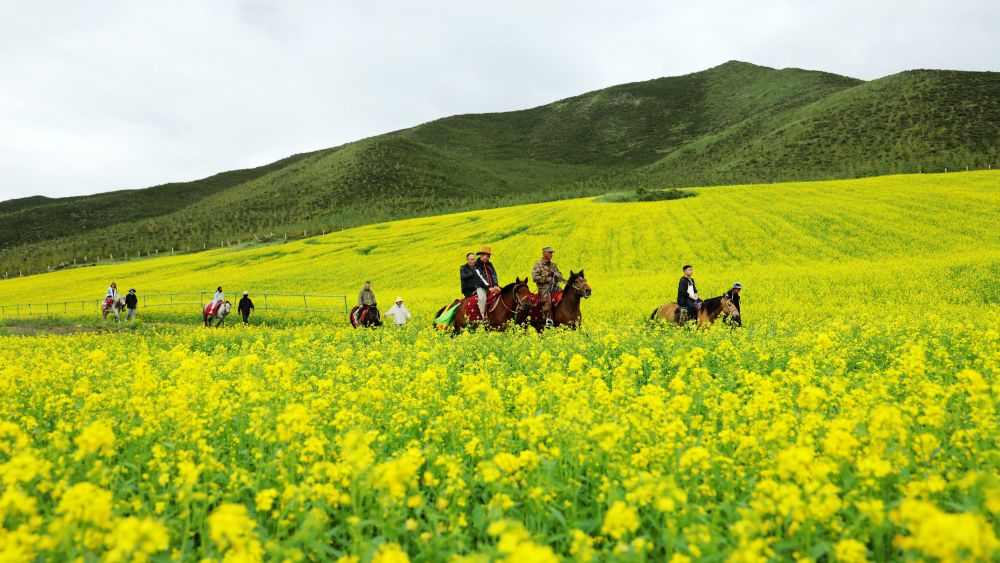 7月13日,游客騎馬游覽甘肅省張掖市民樂縣扁都口生態(tài)景區(qū)油菜花海。新華社發(fā)(成林?jǐn)z)