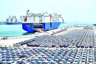 加快推進涉外立法工作、協調推進國內治理和國際治理,使得國內大循環和國內國際雙循環不斷暢通。圖為山東港口煙臺港汽車碼頭,整齊停放的商品車等待運輸。新華社發