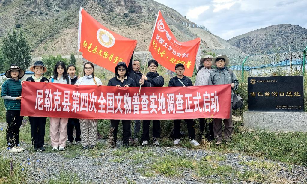 尼勒克縣第四次全國文物普查工作隊在吉仁臺溝口遺址合影。新華社發(受訪者供圖)