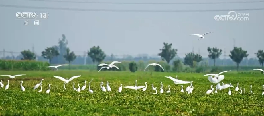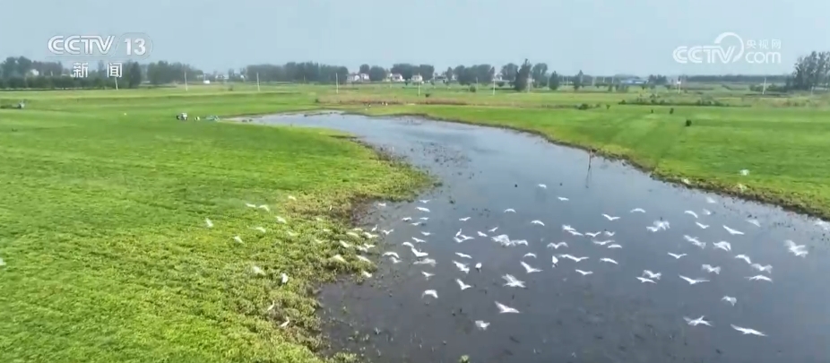 在河南周口市淮陽區,由于近期降雨頻繁,當地古運河不少低洼地帶變成灘涂濕地,多群白鷺匯聚于此,棲息覓食。