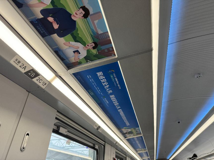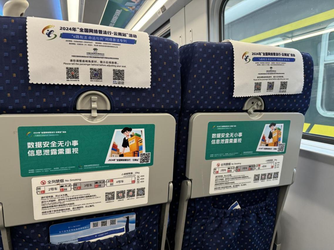 據介紹,專列的8個主題車廂分別以“中國網絡法治三十年”“網絡安全”“數據安全”“未成年人網絡保護”“數據出境之旅”“反網暴凈網行動”“個人信息守護”以及“網絡空間命運共同體”命名,通過鏡框海報、玻璃貼、小桌板貼、行李架彩貼、頭枕片、車內LED信息屏等形式多樣的載體,全面展示網絡法治30年成就、網絡空間命運共同體主張。讓乘客們在享受舒適旅途的同時,也能輕松學習到實用的法律信息。