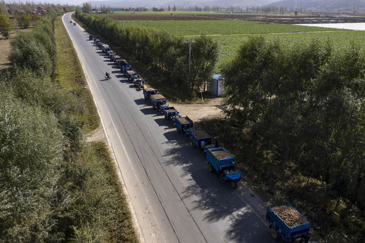 交售馬鈴薯的農用車在寧夏固原市西吉縣馬蓮鄉一家淀粉廠門前排起長隊(2020年10月21日攝,無人機照片)。新華社記者 王鵬 攝