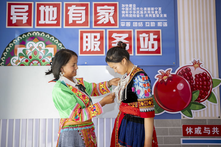 在寧夏青銅峽市瞿靖鎮毛橋村“異地有家”服務站,來自貴州的苗族務工人員楊文高(左)在給放暑假的大女兒整理服飾。楊文高將民族服飾從老家帶到寧夏,在工作之余就會穿上民族服飾(2024年8月23日攝)。新華社記者 楊植森 攝