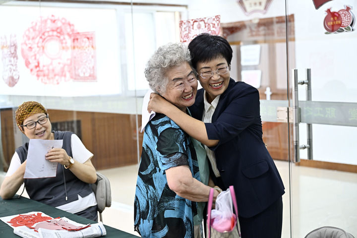 寧夏銀川市金鳳區長城花園社區書記趙耐香(右一)在社區“才藝堂”與居民交流(2024年6月20日攝)。新華社記者 王鵬 攝