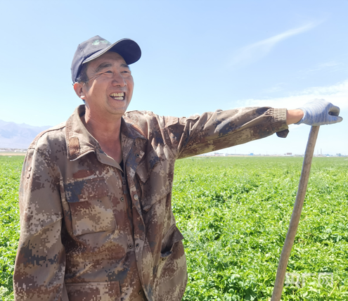 馬鈴薯種植基地管護(hù)人員高玉輝向記者介紹情況(央廣網(wǎng)記者 夏莎 攝)