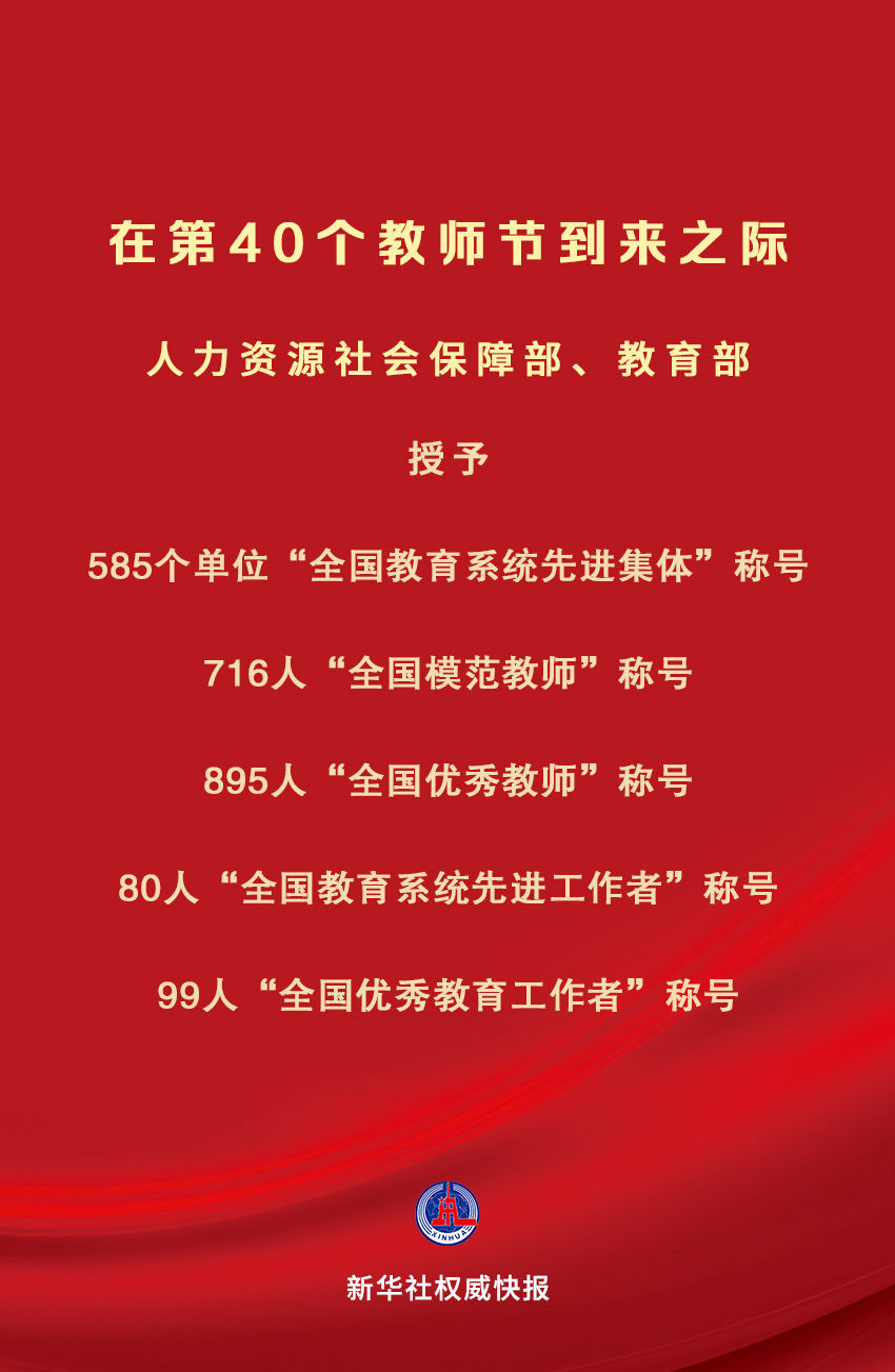 在中華人民共和國成立75周年和第40個教師節到來之際,為大力弘揚教育家精神,營造全社會尊師重教濃厚氛圍,激勵全國廣大教師和教育工作者落實立德樹人根本任務,積極投身教育強國建設,人力資源社會保障部、教育部決定授予中央財經大學金融學院等585個單位“全國教育系統先進集體”稱號;授予刁榮春等716名同志“全國模范教師”稱號;授予于淵等895名同志“全國優秀教師”稱號;授予王彥平等80名同志“全國教育系統先進工作者”稱號;授予王軍等99名同志“全國優秀教育工作者”稱號。