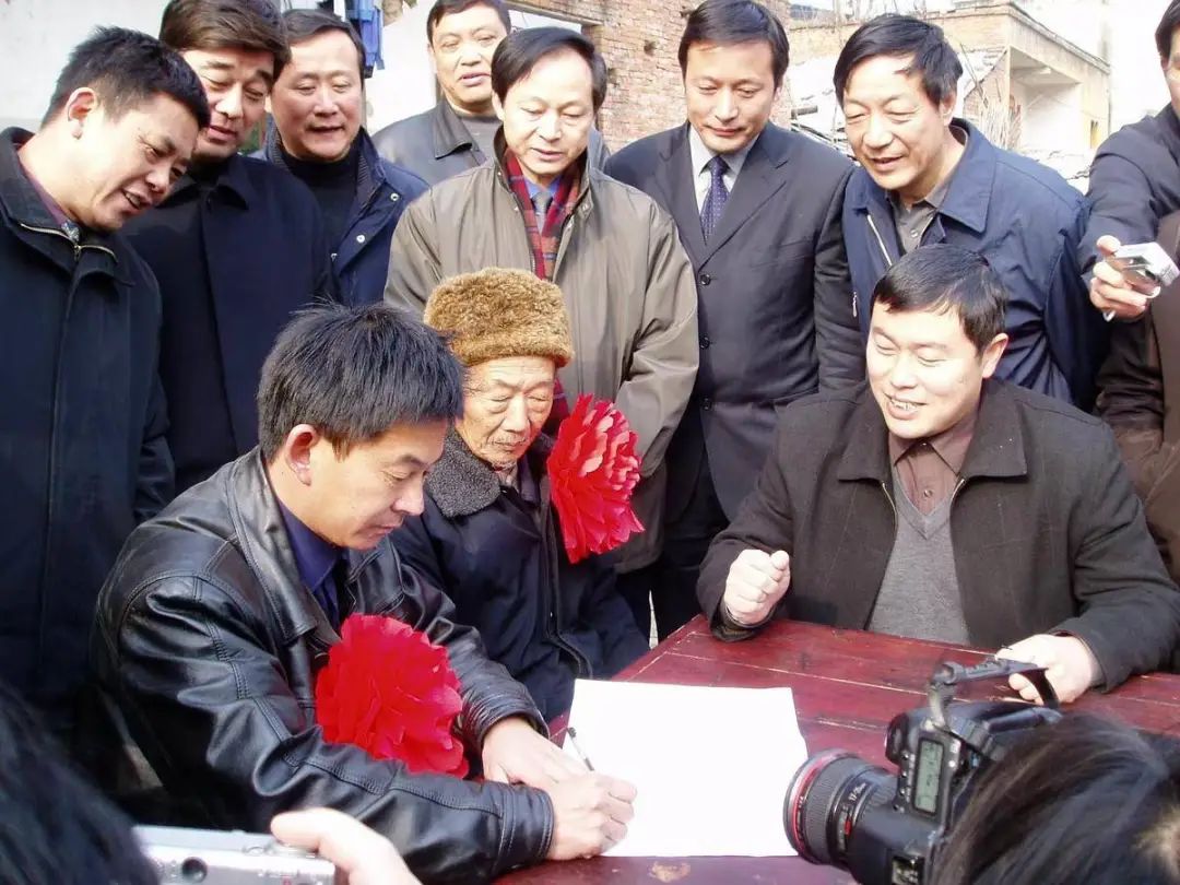 2005年1月5日,丹江口市三官殿辦事處馬灣村村民王瑞權(左一)與辦事處負責人簽訂搬遷合同,成為南水北調中線工程移民搬遷第一戶。(湖北日報通訊員 陳華平 攝)