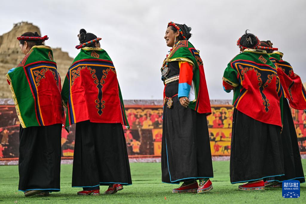 在西藏阿里地區札達縣古格王國遺址腳下,當地村民表演“宣舞”后互相交流(9月11日攝)。