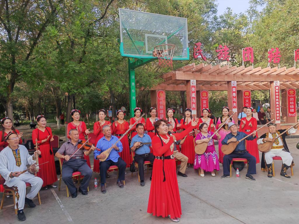 9月19日,庫爾勒市朝陽街道團結社區“石榴籽藝術團”正在為居民們表演。新華社記者顧煜 攝