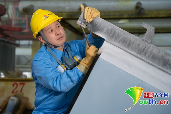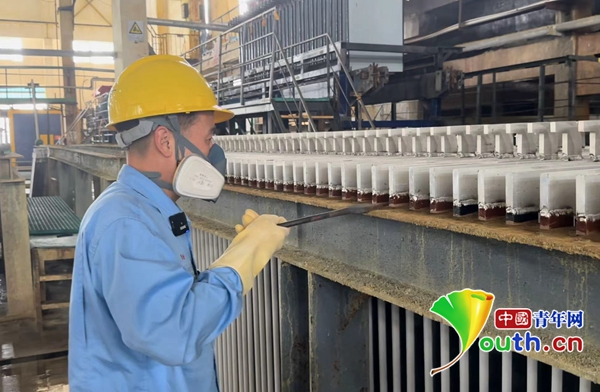 柳祥國在檢查陰極板導電頭。中國青年網記者 高蕾 攝