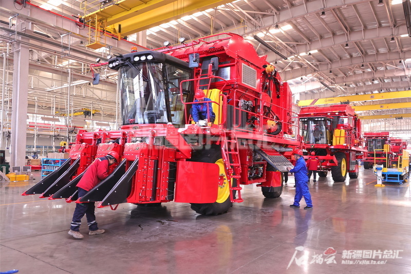 2024年3月12日,工人在位于五家渠市的新疆天鵝現代農業機械裝備有限公司采棉機生產線上生產采棉機。李華北攝