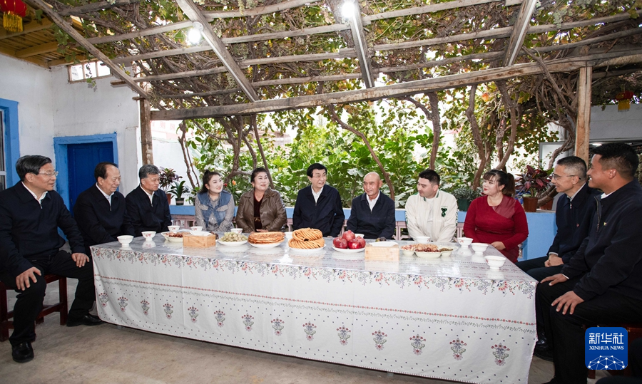 10月21日至24日,中共中央政治局常委、全國政協主席王滬寧在新疆和田、喀什調研。這是23日下午,王滬寧在疏勒縣塔孜洪鄉臺吐爾村同干部群眾交流。新華社記者 李濤 攝