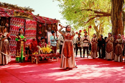尉犁縣羅布人村寨傳統婚禮表演。豐盼攝