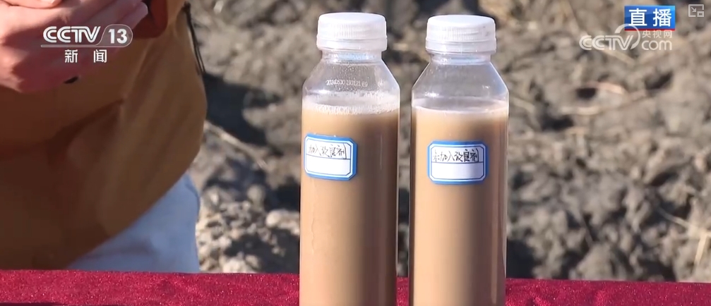 這片田采用的是有機(jī)硅改良劑來治理的鹽堿地,選取同地塊的鹽堿土溶于水中,加入有機(jī)硅后,土壤和水快速分層。可以看到,有機(jī)硅具有較強(qiáng)的親土性,可以和土壤包裹一起,阻斷鹽分吸收,從而達(dá)到降堿和改變土壤板結(jié)的作用。這能讓水稻更好地扎根生長(zhǎng),渾濁的水變清澈,也可以增加作物的光合作用,有效治理重度鹽堿土壤。