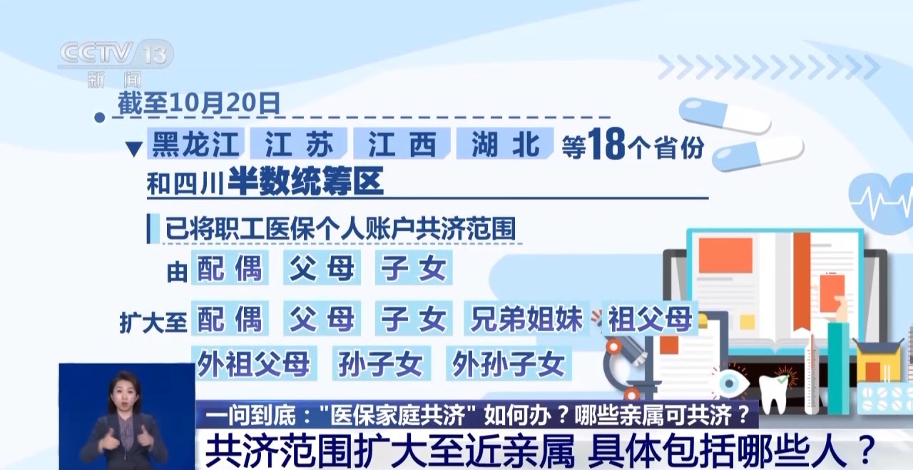 截至10月20日,黑龍江、江蘇、江西、湖北等18個省份及四川半數(shù)統(tǒng)籌區(qū)已將職工醫(yī)保個人賬戶共濟范圍由“配偶、父母、子女”擴大至“配偶、父母、子女、兄弟姐妹、祖父母、外祖父母、孫子女、外孫子女”。