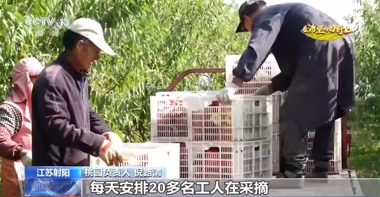 在鹽城市射陽縣新坍鎮的一處桃園種植了4萬多株桃樹。果農們忙著摘桃、分揀、裝筐,預計整個采摘銷售期能持續一個月左右。