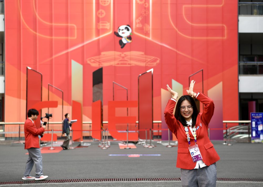 11月4日,志愿者在第七屆中國國際進口博覽會舉辦場地——國家會展中心(上海)留影。