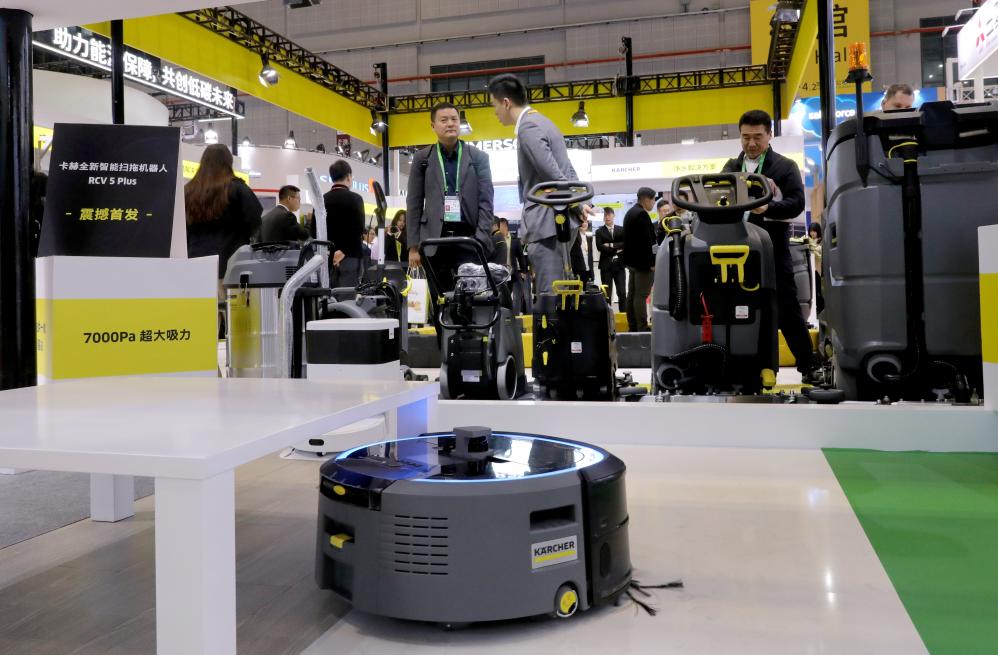 11月6日,一臺卡赫全新智能掃拖機器人RCV 5 Plus(前)在進行作業演示。這是該產品在進博會上的首展首發。新華社記者 方喆 攝