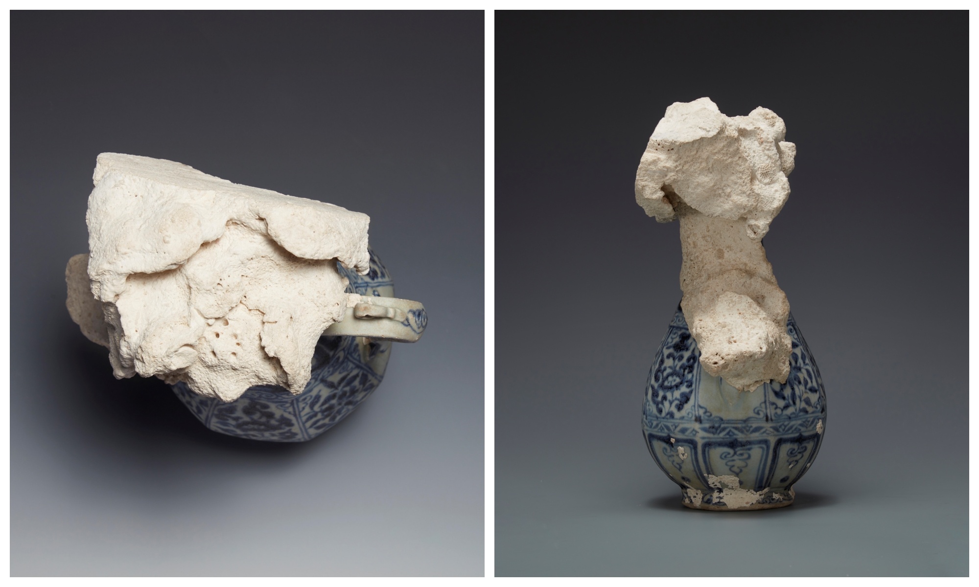 △中國(海南)南海博物館藏元青花花卉紋八棱執壺(左)與河北博物院藏青花八棱執壺對比。