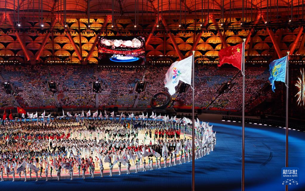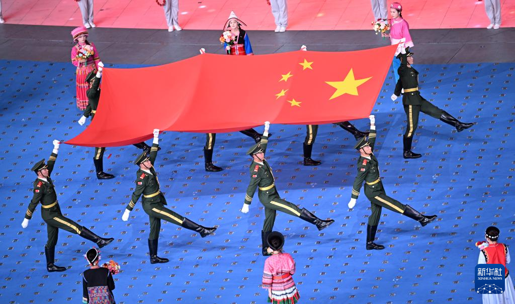 11月22日,開幕式現場升起中華人民共和國國旗、中華人民共和國少數民族傳統體育運動會會旗和中華人民共和國第十二屆少數民族傳統體育運動會會旗。
