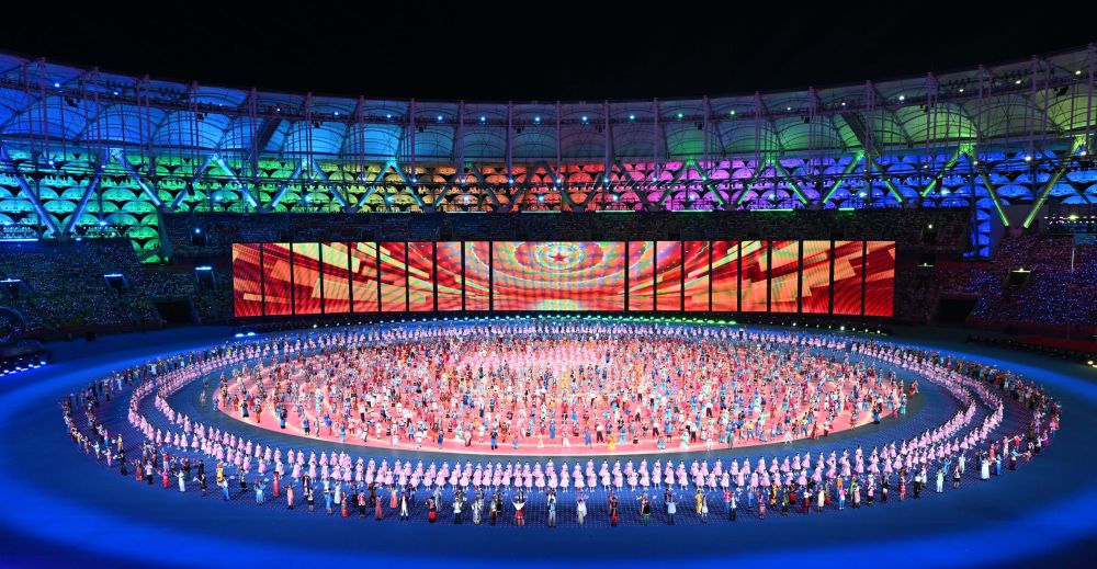 舞臺(tái)中間是一個(gè)圓形地屏,地屏外圈,導(dǎo)演組專門增加“星空矩形”地毯,圍繞中心地屏影像始終保持圓形圖案,構(gòu)成“同心圓”;在入場儀式、節(jié)目展演、點(diǎn)燃火炬等多個(gè)環(huán)節(jié),身穿各民族傳統(tǒng)服飾的參賽人員、表演者等,多次在舞臺(tái)匯聚成“同心圓”;“一顆心,一個(gè)圓,一齊擁抱緊相連……”“同心圓”概念也在主題曲中彰顯。