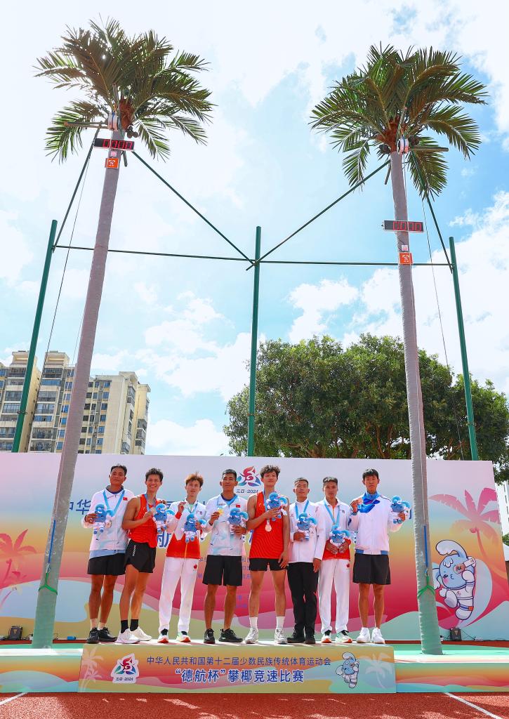 11月24日,獲獎選手在頒獎儀式上合影。當日,第十二屆全國少數民族傳統體育運動會攀椰競速男子9米決賽在西南大學三亞中學體育場舉行。新華社記者 楊植森 攝