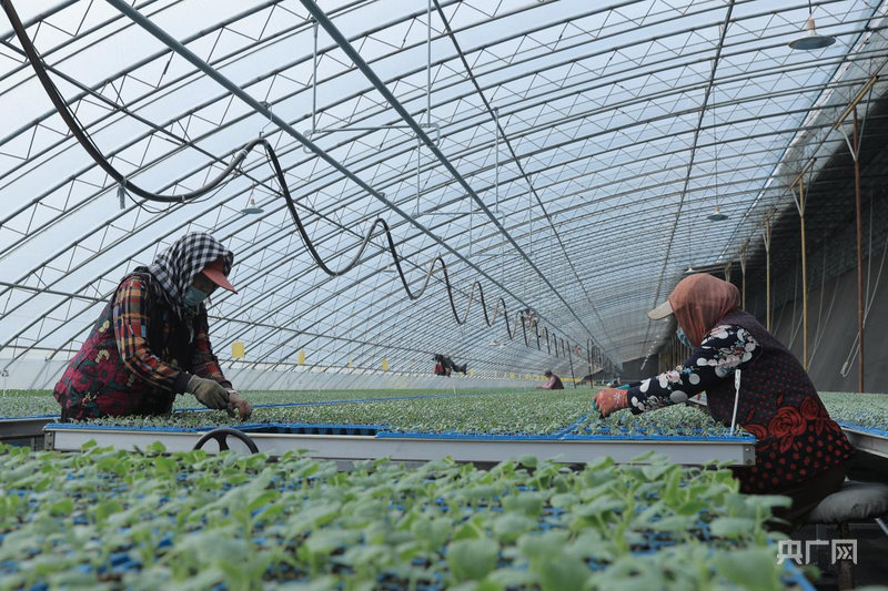 溫室大棚里農戶在管理幼苗(央廣網發 劉九維 攝)