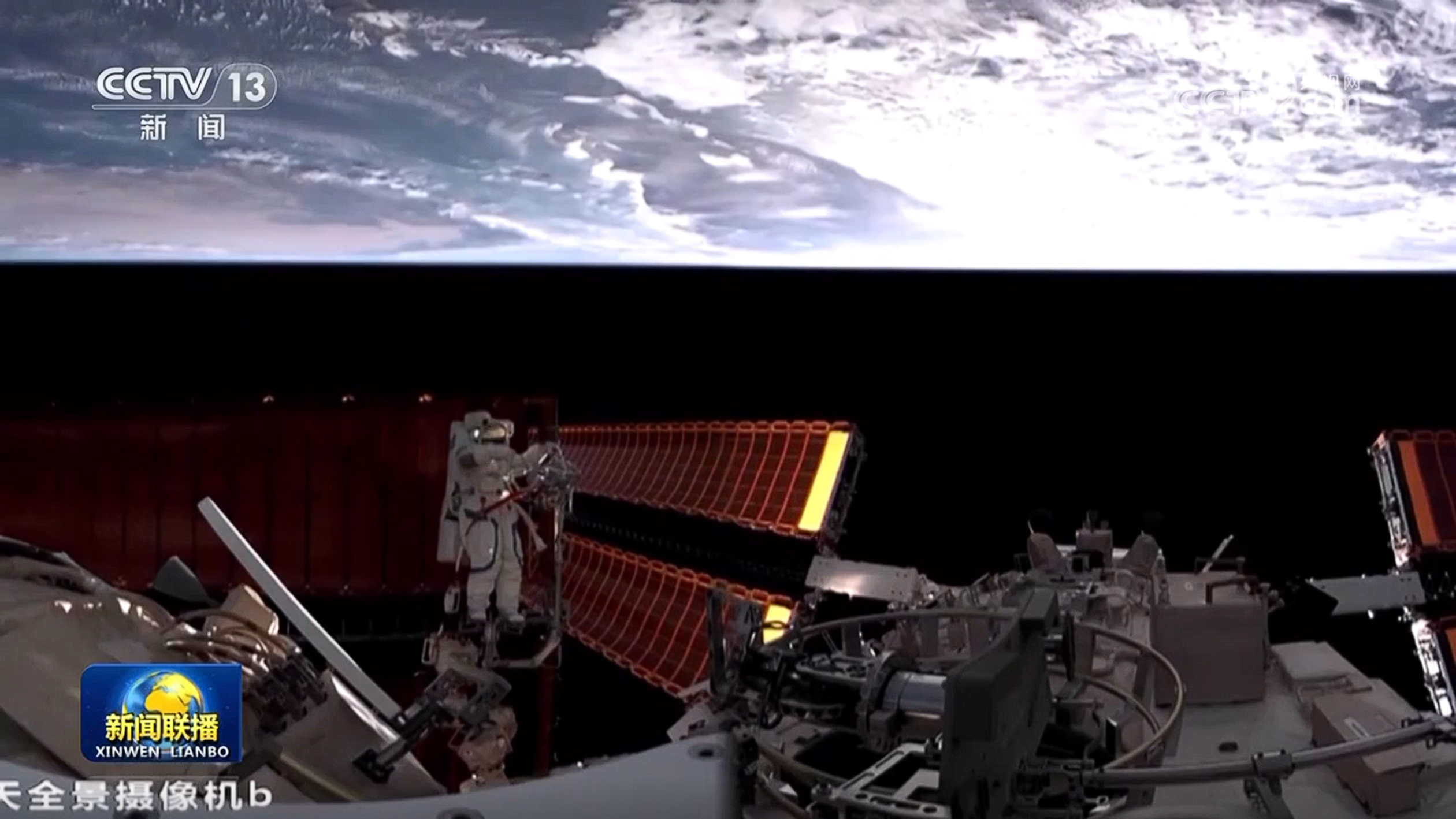 約2個小時后,蔡旭哲順利出艙,沿艙壁自主轉移至作業點,與宋令東協同配合,對問天艙線纜進行防護裝置的安裝操作。其間,航天員王浩澤在天和核心艙內進行支持。