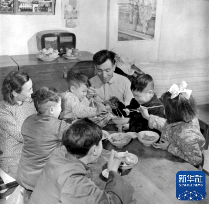 1953年春節,天津市民王德鑄(左一)一家人吃團圓飯。新華社記者 盛果 攝